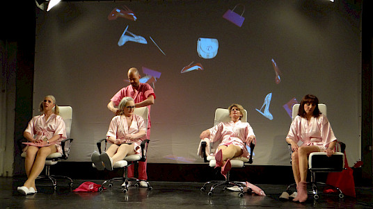Wie reizend! Zum Internationalen Frauentag lädt die Regierung alle Frauen ab einem gewissen Alter als Dankeschön für ihren unermüdlichen Einsatz in Beruf und Familie zu einem kostenlosen Wellness-Tag ein. Und so treffen in Sibylle Bergs Theaterstück Die Damen warten vier-Frauen um die Fünfzig in einer obskuren Wohlfühl-Oase aufeinander. Die Lebenswege und -entwürfe der Damen könnten unterschiedlicher nicht sein: Frau Merz-Dulschmann, verheiratete Hausfrau und Mutter („Ich genieße die Freiheit, die das Leben theoretisch für mich bereithält“). Frau Luhmann, Angestellte und alleinerziehende Mutter („Warum habe ich das Gefühl, eine unsichtbare Wurst zu sein?“). Frau Töss, Anwältin und ewige Geliebte („Heinz …, so heißen sie alle, und alle sind sie verheiratet“). Frau Grau, Gerichtsmedizinerin und überzeugte kinderlose Singlefrau („Ich glaube, die meisten Frauen stellen nur Kinder her, damit sie in ihrer Wohnung nicht dauernd mit dem Feuerlöscher verwechselt werden“). Umsorgt und verwöhnt werden die Damen von Horst („Ich bin heute nur für Sie da“), der neben kosmetischen Behandlungen und Massagen noch ein umfangreiches Repertoire frauenfeindlicher Zitate auf Lager hat („Wenn Frauen nicht mehr wissen, was sie tun sollen, ziehen sie sich aus, und das ist wahrscheinlich das Beste, was Frauen tun können“). So unterschiedlich die Lebensentwürfe der Frauen sein mögen – zwischen Schokowickeln und Epilation, Algenbad und Wechseljahresgymnastik stellen sie bald fest, dass eines sie eint: Sie alle halten das Räderwerk einer Gesellschaft am Laufen, in der nach den Regeln und Vorstellungen der Männer gespielt wird: Bei der Besetzung von Führungspositionen werden die Frauen übergangen, sie dienen den Männern als Lustobjekt, das mit fortschreitendem Alter schlicht uninteressant wird, Kindererziehung bleibt Frauensache, weil die Männer ohnehin besser verdienen und, und, und …
