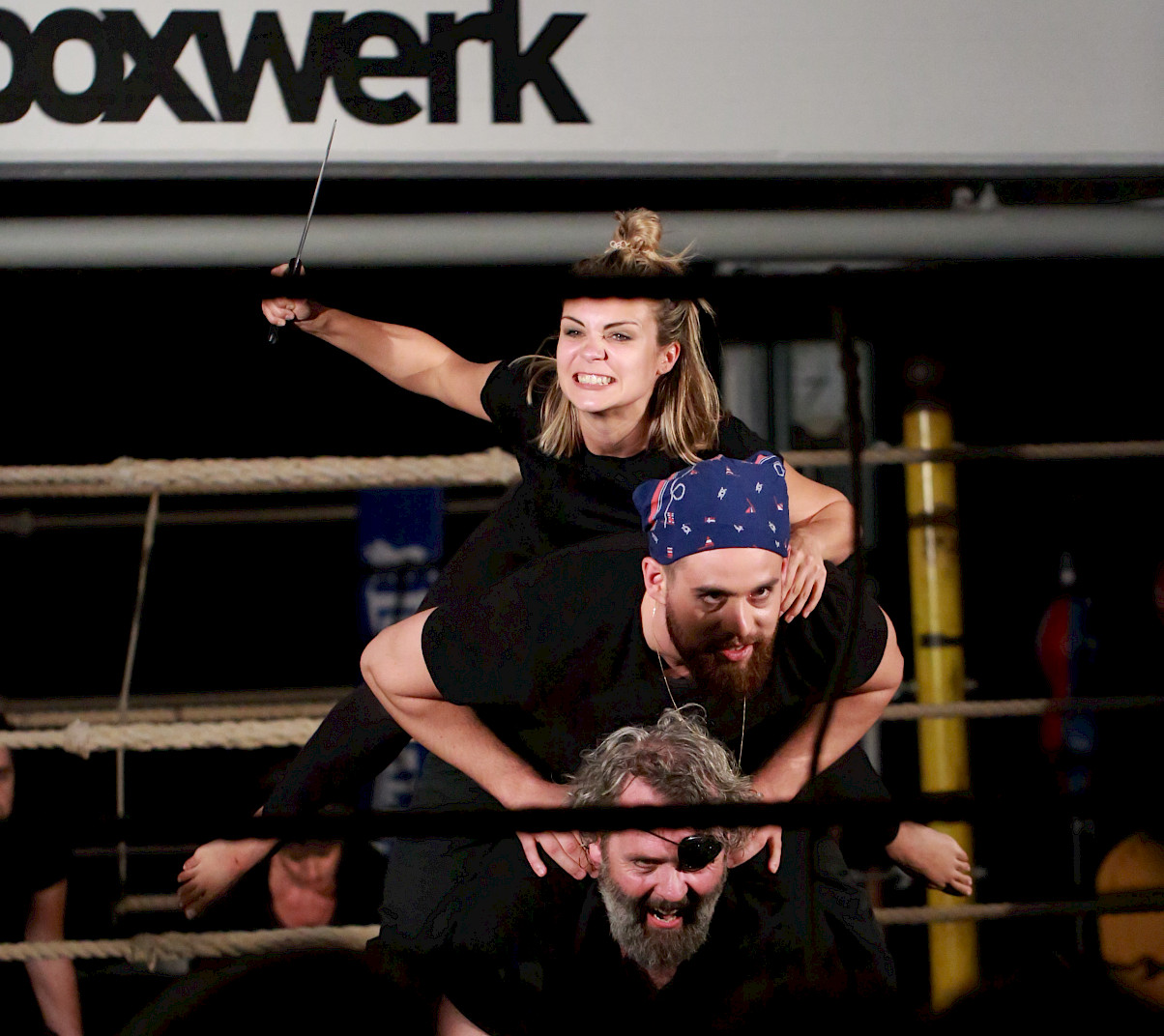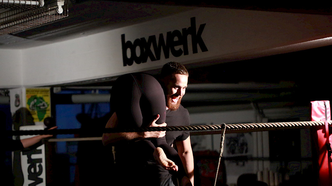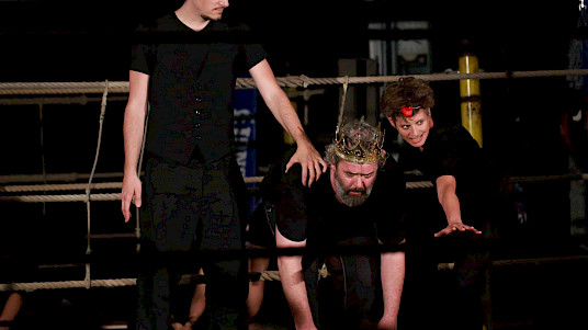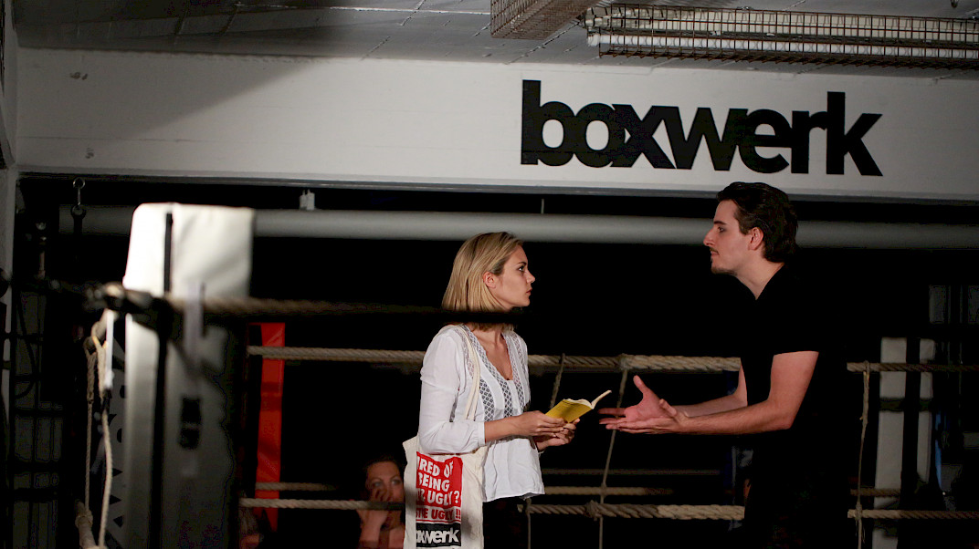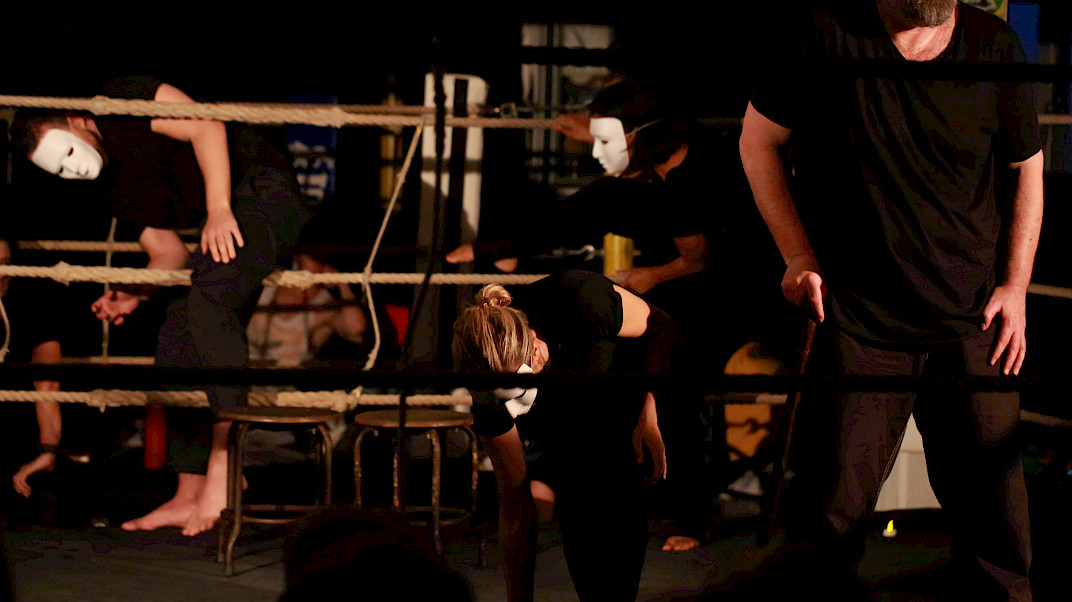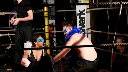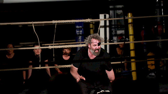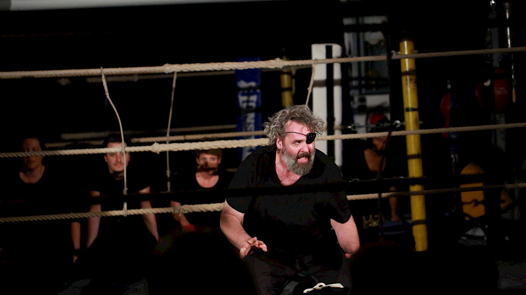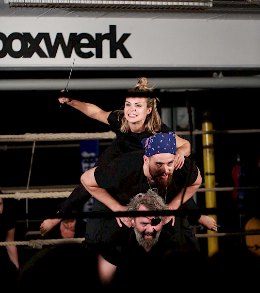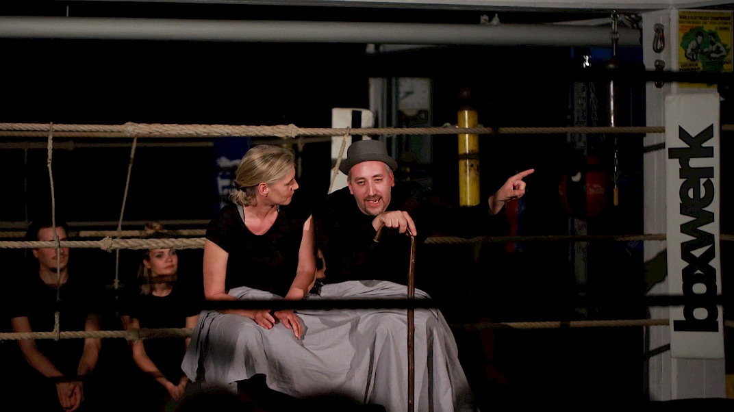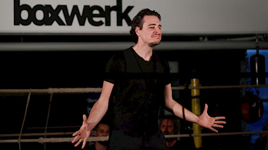 Goethes Faust ist ein Wahnsinnsritt durch Zeiten und Welten. Da stellt sich natürlich eine ganz neue Gretchenfrage: Passen all diese Themen, diese irrwitzigen Geschichten und zahllosen Schauplätze auf eine mit Seilen umspannte Bühne von 4 x 4 m? Passt das alles in einen Boxring? Es passt. Diese – vielleicht überraschende – Antwort gibt die Tollhaus Theater Compagnie mit «Faust im Ring». Denn hier schreiten die Schauspieler – um es mit den Worten des Direktors im Vorspiel auf dem Theater zu sagen – in einem engen Hinterhaus »den ganzen Kreis der Schöpfung aus, und wandeln mit bedächt´ger Schnelle vom Himmel durch die Welt zu Hölle.«