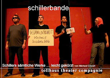 In diesem rasanten Parcours durch Schillers Dramenwelt – von den Räubern über Don Carlos und Wilhelm Tell bis zur Braut von Messina – können Sie Zeugen erstaunlicher Verwandlungsprozesse werden: Erleben Sie mit, wie der Präsident aus Kabale und Liebe zum Mafiapaten mutiert oder der Feldherr Wallenstein zu Adolf Hitler. Verfolgen Sie, wie gestandene Mannsbilder in die Rollen von Maria Stuart und Königin Elisabeth, von Luise Millerin oder der Jungfrau von Orléans schlüpfen. Und entdecken Sie, dass Schillers Dramen durch einige wenige Streichungen und ziemlich viele Kalauer eine rasend komische Revue ergeben.